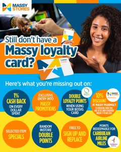Massy Card – Apply here or online at www.massycard.com for your Massy Card and begin to earn your rewards.